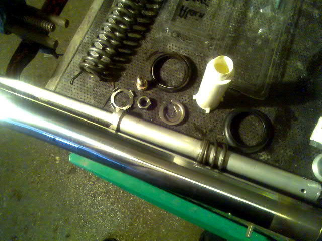 2°vider l'huile et disposer les pieces de la fourche sur une "loque" et se souvenir de l'ordre dans lequel les pieces doivent se repositioner ou tt simplement les disposer l'une a la suite des autres pour etre sur de ne pas se tromper lors du remontage